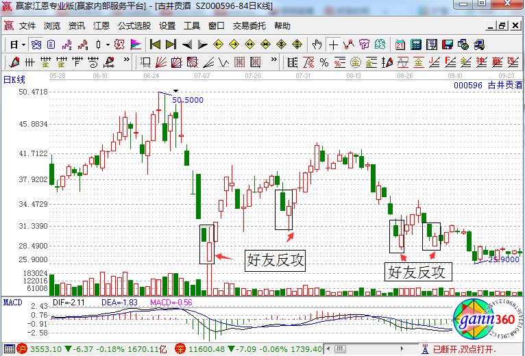在8月24日、25日和9月1日、9月2日的時候,股價有出現(xiàn)了兩次好友反攻形態(tài),股價也是短暫反彈后繼續(xù)往下跌。顯然這樣的好友反攻形態(tài),僅僅具有短期指導(dǎo)意義。