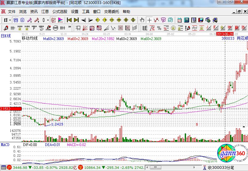 上圖是同花順在2013年部分走勢(shì)圖,從上圖我們可以看到該股在5月份的時(shí)候突破60日均線走出了一波很有力度的上漲行情,6月份隨大盤該股出現(xiàn)補(bǔ)跌,月底啟穩(wěn)在60日均線附近,經(jīng)過1周時(shí)間的整理,6月28日該股出現(xiàn)向上突破趨勢(shì),此時(shí)出現(xiàn)很好的短線買點(diǎn),隨后一路放量上漲,連續(xù)暴拉,截止到最后一根陽線的話有80%以上的漲幅,牛股風(fēng)采盡顯。
