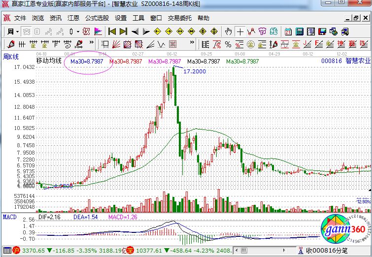 個(gè)股走勢(shì)中的30日均線是非常重要的,在股價(jià)上升的時(shí)候它是條支撐底線,個(gè)股下挫后反彈它又是條阻力線,如果個(gè)股在下調(diào)后企穩(wěn),向上反彈時(shí)沖擊30日均線明顯有壓力,上攻30日均線時(shí)成交量也沒有放大配合,股價(jià)在沖擊30日均線時(shí)留下的上影線較長(zhǎng)(表明上檔阻力強(qiáng)),那么投資者可以進(jìn)行及時(shí)的減磅,如下面的智慧農(nóng)業(yè)走勢(shì)圖。