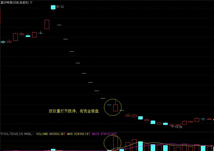 對于一字跌停板來說,全天成交量越小,換手率月底,就說明了空方的拋壓越多,多方的承接盤也就越少了,所以相應的后續(xù)下跌的力量就會更強,跌幅更大。相反的,如果成交量越大,換手率就越高,那就說明了多方承接盤開始大量介入,相應的股價就會立即止跌企穩(wěn)。如下面的重慶啤酒走勢圖。