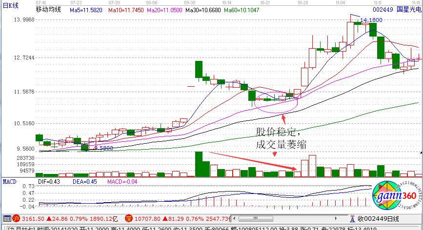 在空頭市場中,投資者都是看壞后市的,但是如果出現(xiàn)了股票價格穩(wěn)定,同時成交量也在萎縮,顯然是一種買入的信號,如下面的國星光電走勢圖。