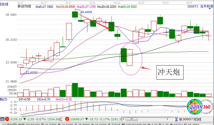條件3、沖天炮呈現(xiàn)后,第二天就可以買入了,止損點可以設在沖天炮當天的最低價,破掉的話就有可能是失敗的;