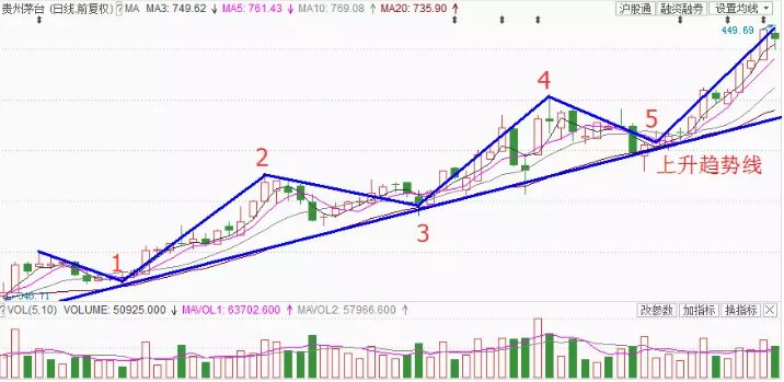 上面是貴州茅臺的走勢圖,從圖中可以看到:連接該股票的每一波的波谷可以劃一條上升趨勢線,該股票一直延續(xù)該條線保持上升趨勢。我們標(biāo)注每一波的波峰和波谷會發(fā)現(xiàn)4>2、5>3>1,也即形態(tài)為過高不破低形態(tài),所以,當(dāng)下次我們碰到這種過高不破低形態(tài)的股票時即可找時機(jī)選擇買入布局。
