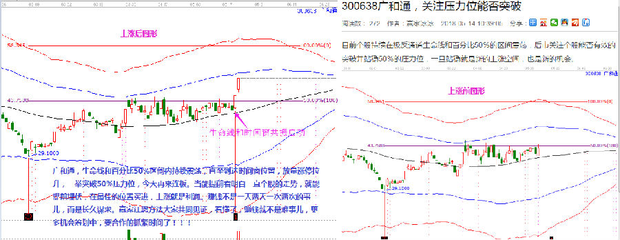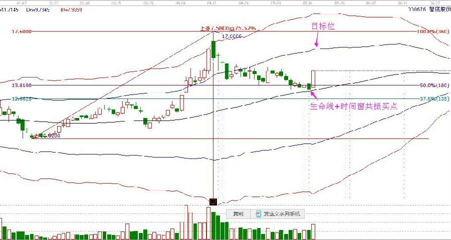 生命線和百分比50%區(qū)間內(nèi)持續(xù)震蕩,直至到達(dá)時間窗位置,放量漲停拉升,依據(jù)突破50%壓力位,連續(xù)兩個漲停板。當(dāng)能提前看明白一只股票的走勢,就能提前埋伏,在最佳的位置買進(jìn),上漲就是利潤。如下圖所示。