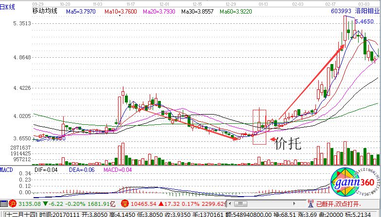 運(yùn)用價(jià)托進(jìn)行抄底的技術(shù)要點(diǎn),主要有三點(diǎn),即①5線上穿10線,5線上穿20線,10線上穿20線,形成三角形;②三角形托著陽(yáng)線,伴隨著成交量放量;③價(jià)托形成后,均線呈現(xiàn)多頭排列。