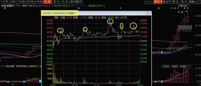 D點(diǎn)介入之后的賣點(diǎn)在哪里呢?我們繼續(xù)看圖,編號G的那筆陽線大家看出什么端倪了嗎?也就是2018年5月22日,收了一根上下影線均較長的K線,不得不使我們要懷疑主力的企圖。再來看那一天的分時(shí)圖。
