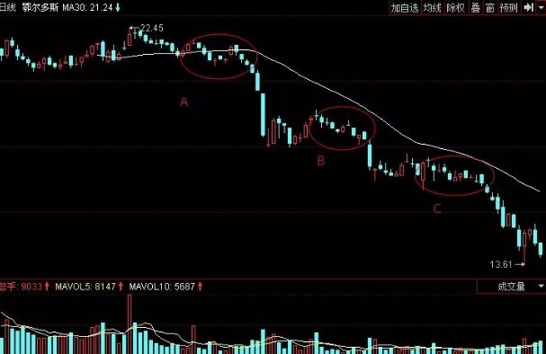 上圖是鄂爾多斯股票軟件中歷史上部分日K線走勢圖,從圖中我們可以看到,該股先是高開,然后開始在高位震蕩盤整。在A處,股價(jià)出現(xiàn)了綿綿陰跌的看跌信號,股價(jià)快速下跌杭州,又開始反彈,但反彈比較弱,隨后又出現(xiàn)綿綿陰跌形看跌信號,即B處。雖然股價(jià)已經(jīng)下跌了很多,但是還是要進(jìn)行出局的,否則就會(huì)被套的更深,在C處股價(jià)先是橫向盤整,然后又出現(xiàn)綿綿陰跌形看跌信號,此時(shí)投資者應(yīng)清倉出局,短時(shí)間內(nèi)不要碰該股票為好。