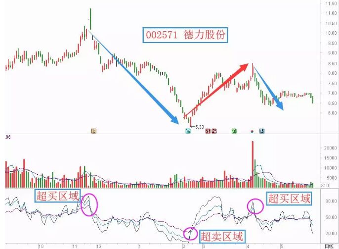 同其他常用的指標(biāo)一樣,該指標(biāo)是有數(shù)值的劃分的。最基本的就是:當(dāng)RSI的值大于50的時(shí)候是強(qiáng)勢(shì)市場(chǎng),高于80以上則進(jìn)入到了超買區(qū)域,股價(jià)在超買區(qū)域容易形成短期的調(diào)整;小于50為弱勢(shì)市場(chǎng),低于20以下進(jìn)入超賣區(qū)域,股價(jià)在超賣區(qū)域容易形成短期的反彈。如下面的德力股份走勢(shì)圖。