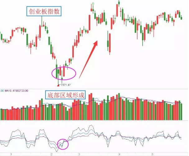 形態(tài)不僅在K線上可以運(yùn)用,在RSI指標(biāo)分析中,也能夠進(jìn)行大量的運(yùn)用,可以依據(jù)超買區(qū)和超賣區(qū)的頭肩頂或底、雙頭或底等反轉(zhuǎn)形態(tài)來(lái)進(jìn)行買賣的判定,如下面的創(chuàng)業(yè)板指數(shù)走勢(shì)。