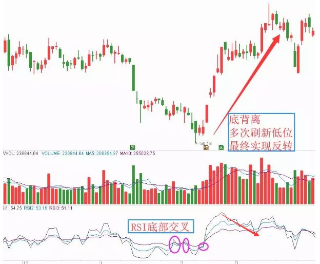 股價(jià)一波比一波底,相反的RSI卻一波比一波高,這就是先行的底背離,股價(jià)很容易形成反轉(zhuǎn)上漲的走勢(shì),如下面的圖形所示。相反地,如果股價(jià)一波比一波高,該指標(biāo)一波比一波低,那么這個(gè)時(shí)候就是頂背離,此時(shí)股價(jià)就容易出現(xiàn)反轉(zhuǎn)下跌。