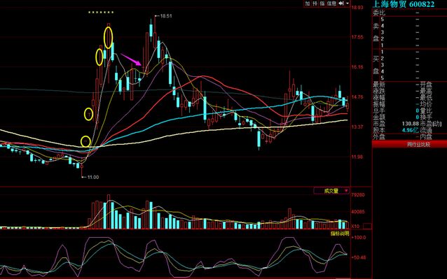 打開股票軟件調(diào)出上海物貿(mào)在去年11月份的走勢,從圖中偶們可以看到股價前面先后是出現(xiàn)了4個漲停板基因的,在2017年11月13日時當(dāng)天股價呈現(xiàn)了高開異動上漲,同時對比前一天成交量的話,當(dāng)天呈現(xiàn)明顯的放大,如圖中粉紅色箭頭所指的那根K線。在走勢中沒有下探回補(bǔ)當(dāng)天跳空高開的缺口,在第二天股價就呈現(xiàn)出了漲停。