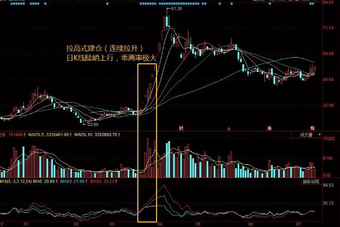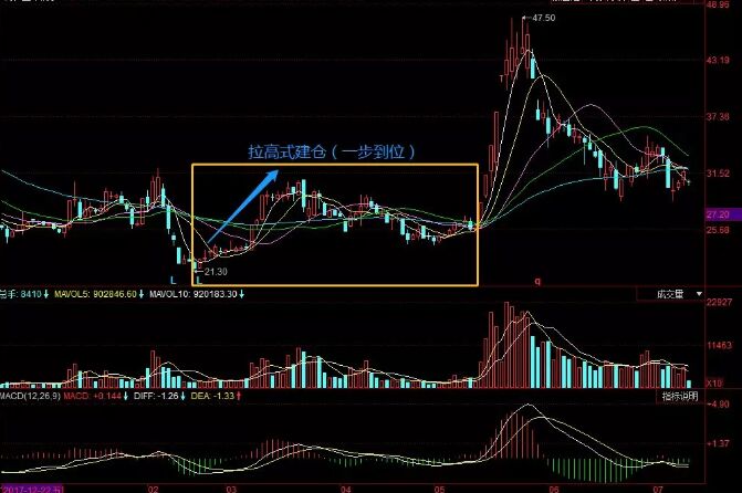 拉高式建倉大多是出現(xiàn)在冷門股以及長期下跌的股票中,具體的表現(xiàn)就是:股價(jià)迅速從低位抬高,成交量急速放大。這種以空間換取時(shí)間的建倉方式表明莊家實(shí)力雄厚、作風(fēng)兇悍,后期必有巨大的上升空間。拉高式建倉一般有兩種情況,即一步到位式和連續(xù)拉升式。