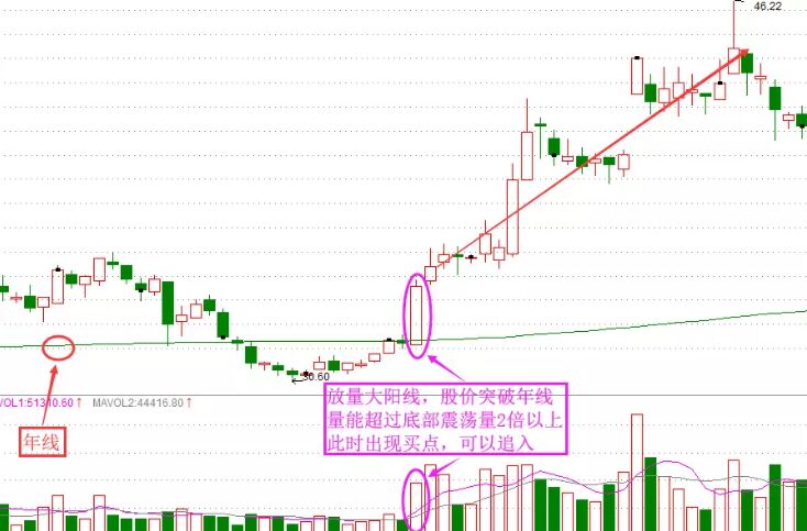 從上面青島啤酒的K線圖中,我們可以看到,這只股票在前期震蕩調(diào)整,然后來到了年線附近,并且在年線附近進(jìn)行逐步的走穩(wěn),隨后,一根放量大陽線,將股價(jià)推升至年線上方,此時(shí)的量能是前期底部量能的2倍以上,符合大牛擎天形態(tài),在這個(gè)時(shí)候投資者就可以進(jìn)行買入了,因?yàn)楹笃谑菚?huì)有充足的獲利空間。