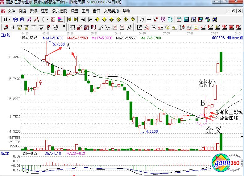 上面就是湖南天雁近期的日K線走勢(shì)圖,從圖中可以看出,在B區(qū)域,股價(jià)是在企穩(wěn)后的低位區(qū),在7月20日,股價(jià)出現(xiàn)了17日均線和26日均線形成金叉。在7月23日到25日,三天,股價(jià)均出現(xiàn)了帶有長(zhǎng)上影線的放量陽(yáng)線,暗示主力向上做多意向,同時(shí)滿(mǎn)足了這三個(gè)條件后,沒(méi)過(guò)多久,股價(jià)便迎來(lái)了持續(xù)的拉升,顯然是非常強(qiáng)勢(shì)的。