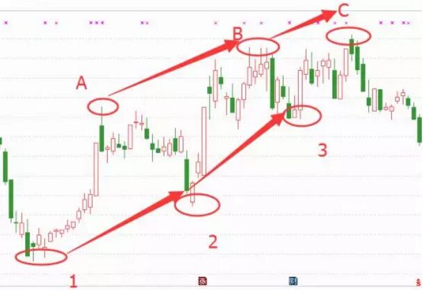 如上圖所示,低點1、2、3被不斷的抬高,而高點A、B、C也被不斷的抬高,所以只有低點是一波高于一波的,高點也是一波高于一波才能被確認是處于上升趨勢。