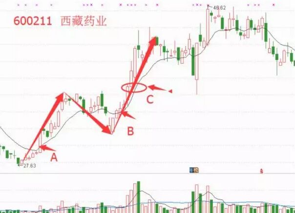 從圖中可以看到,雖然股價進行回調(diào)但始終沒有突破前低,之后一根大陽線再次上穿BBI線,如圖B處,這個時候還是可以看做一次短線操作的機會,再到C處股價突破了前高,才可以轉(zhuǎn)化為中線思維,表示一次上漲行情的開啟。