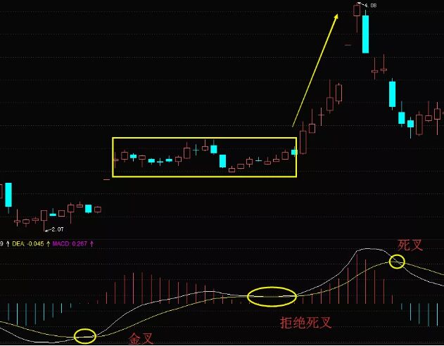 下圖是春興精工在歷史上的部分截圖,從圖中我們可以看到,股價(jià)在經(jīng)過了長期下跌之后,從低位進(jìn)行回升,而macd形成金叉,之后股價(jià)進(jìn)行盤整,macd也止住上升走勢,白線下行與黃線粘合,想要形成死叉,結(jié)果粘合許久竟然沒有形成死叉,結(jié)果有轉(zhuǎn)頭向上了,還形成了一波比較強(qiáng)的走勢,此處macd的狀態(tài)就是“拒絕”形態(tài)的中的拒絕死叉。