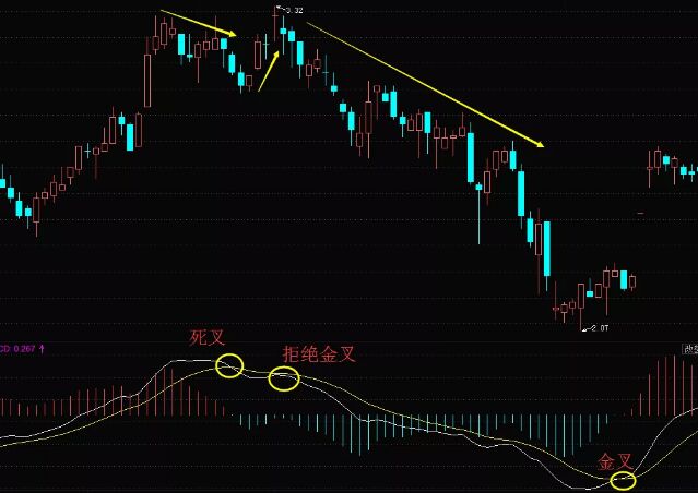 如上圖所示,股價(jià)經(jīng)過了一段時(shí)間的上漲,已經(jīng)是處于相對(duì)的高位了,股價(jià)已經(jīng)是無力上漲了,所以開始下跌,macd白線下穿黃線形成死叉,此后股價(jià)很快進(jìn)行反彈再次沖擊前高,macd欲形成金叉,但白線剛觸及黃線,股價(jià)即無力下跌,金叉尚未形成,白線再度下跌,由此形成“拒絕金叉”,此后股價(jià)與MACD雙線均一路向下,走出下降趨勢。