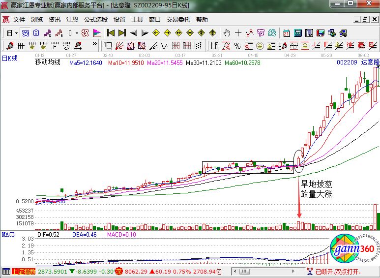 旱地拔蔥是一個成語,它其實指的就是短時間的發(fā)展態(tài)勢一下子上升,所以它通常用來至突然發(fā)生的變化。運用到股市中,當(dāng)然指的就是股價從低位到高位的拉升走勢了,所以它也是一種預(yù)示后市上漲的走勢。具下面我們就結(jié)合達意隆的K線走勢來幫助大家識別旱地拔蔥形態(tài)。