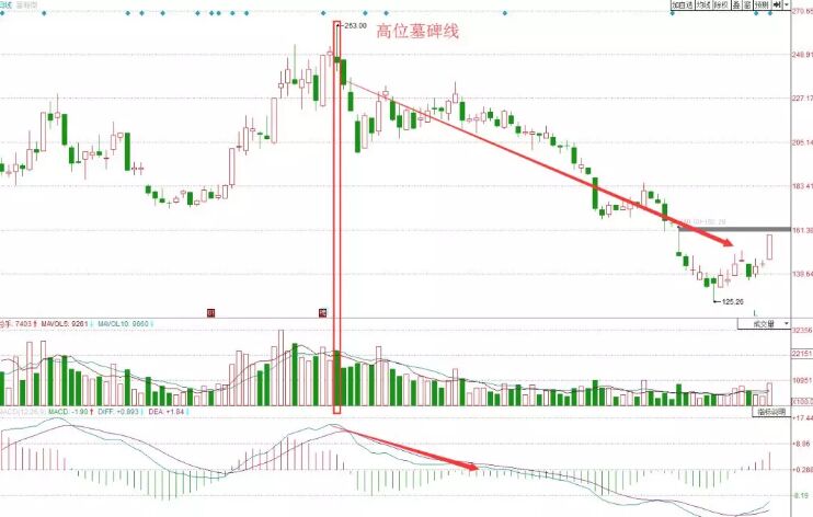 2、低位墓碑線。在低位出現(xiàn)的墓碑線,投資者不要過度恐慌,反而要根據(jù)量價關(guān)系、下跌幅度、技術(shù)指標(biāo)來進行綜合分析。如下面的水晶光電走勢圖。