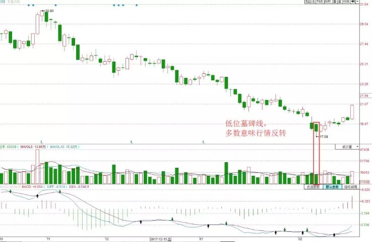 這個時候,下跌陰線是主力故意造出的墓碑線,目的是讓散戶朋友交出手中的籌碼,所以當(dāng)出現(xiàn)這種走勢大家的就可以適當(dāng)?shù)母M買入,因為行情即將反轉(zhuǎn)。
