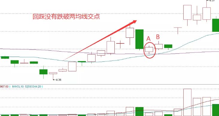 我們通過(guò)觀察可以看到雖然陰線(xiàn)實(shí)體較大,但是下方的量能并沒(méi)有出現(xiàn)明顯放大,同時(shí)大陰線(xiàn)出現(xiàn)之后,也并沒(méi)有跌破55日均線(xiàn)支撐,隨后第二天A點(diǎn)在回踩兩條均線(xiàn)交點(diǎn)后出現(xiàn)上漲行情,隨后B點(diǎn)走出溫和放量上漲的走勢(shì),緊接著又是一根縮量回踩均線(xiàn)不破的小實(shí)體陰線(xiàn),我們基本就可以判定后期上漲趨勢(shì)形成,這時(shí)候我們就應(yīng)該積極進(jìn)場(chǎng)。關(guān)于其他類(lèi)型的,就不在進(jìn)行一一的介紹了。大家可以自行研究。