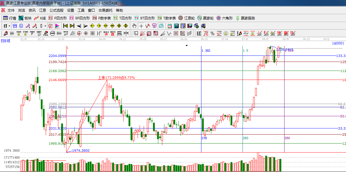 ★依據(jù)贏家江恩系統(tǒng)波段百分比提示:指數(shù)再次強勢上漲,上方阻力180度2232點,225度,2254點