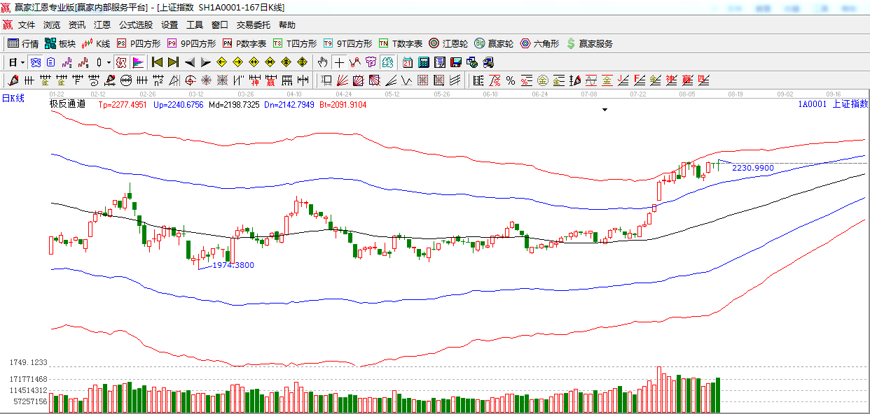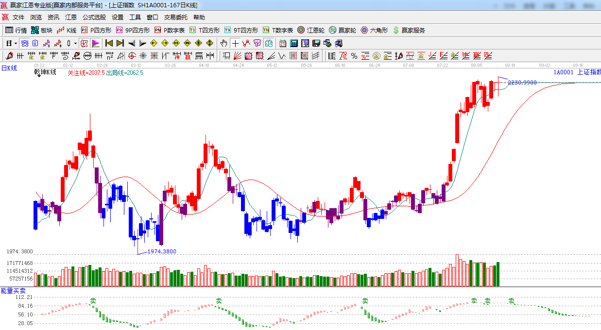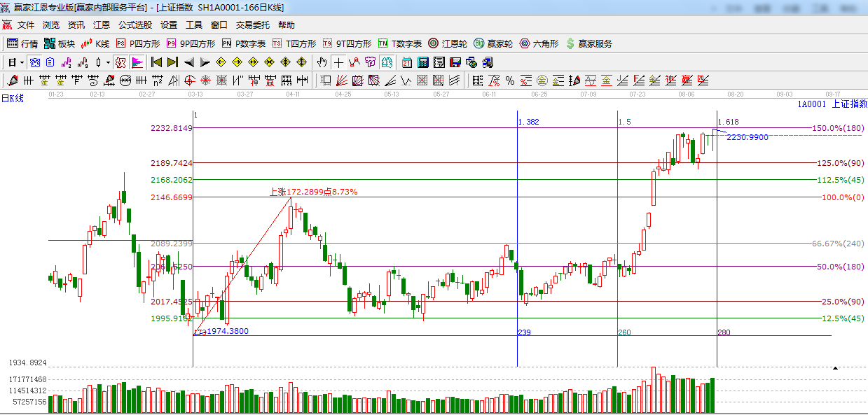 ★依據(jù)贏家江恩系統(tǒng)波段百分比提示:上方阻力180度2232點(diǎn),225度,2254點(diǎn)。