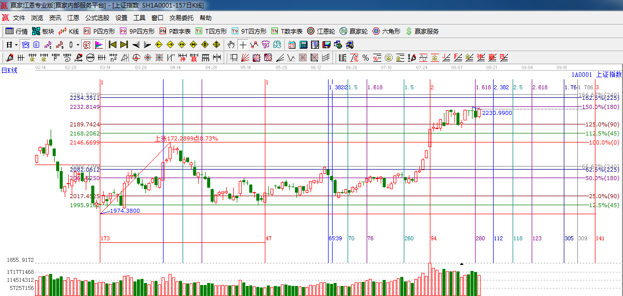 江恩看盤綜述:依據(jù)贏家江恩技術(shù)工具分析得出:,指數(shù)受利好推動展開反彈,但180度2232點阻力憂在,量能較前一交易日萎縮,短期市場仍有震蕩可能,但中期向上趨勢良好。操作上,合理控制倉位,做好高拋低吸。