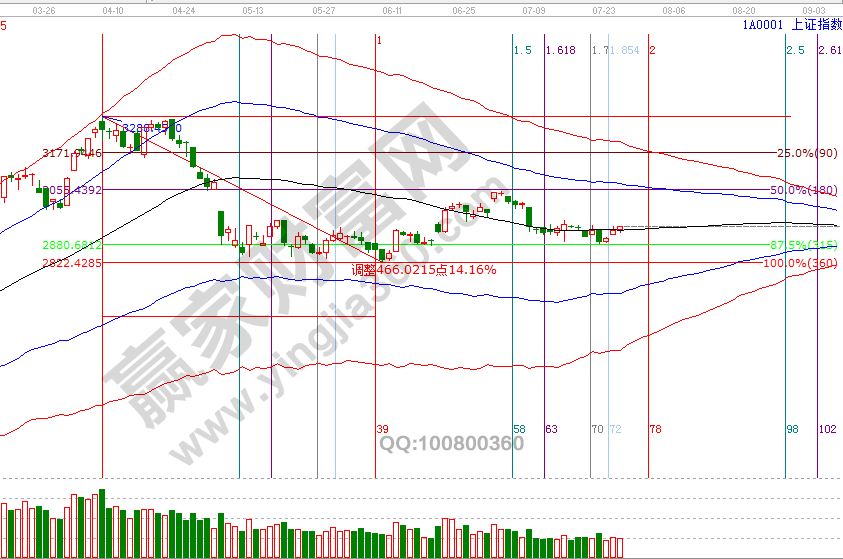 24號(hào)先行指數(shù)上證50收復(fù)短周期60分鐘關(guān)鍵位,贏(yíng)家江恩技術(shù)服務(wù)老師在學(xué)員區(qū)及時(shí)解讀了此信號(hào),收復(fù)此線(xiàn)則代表新一波震蕩反彈動(dòng)作的展開(kāi),周四滬指日線(xiàn)及短周期全部進(jìn)入生命線(xiàn)上安全區(qū)域,需要注意的是短周期15分鐘即將觸碰極反通道藍(lán)色上軌線(xiàn),預(yù)示著26號(hào)早盤(pán)沖高后會(huì)出現(xiàn)滯漲情況,從各周期線(xiàn)關(guān)系看反彈動(dòng)作還將延續(xù),修整是對(duì)突破日線(xiàn)生命線(xiàn)一次確認(rèn)動(dòng)作,此處反彈空間與時(shí)間維持不變,下個(gè)時(shí)間窗口是8月1號(hào),7月26號(hào)盤(pán)中壓力是225度2944點(diǎn)、270度2961點(diǎn),盤(pán)中支撐是135度2911點(diǎn)。操作策略,指數(shù)極反通道生命線(xiàn)震蕩,信號(hào)延續(xù)價(jià)格看60分鐘上軌線(xiàn),時(shí)間看8月1號(hào),信號(hào)結(jié)束為上證50失守60分鐘生命線(xiàn),整體持倉(cāng)保持3成。