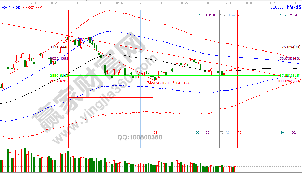 從江恩時間周期角度分析,市場又到了一個日線方向選擇區(qū),回顧近幾個月指數(shù)時間窗口(3月7號、4月8號、5月17號、6月5號、27號、7月3、15、23號),市場的重要級別、次要級別的時間拐點都是提前做出測算并公布,今天收盤后贏家江恩技術(shù)團隊將借助工具分享8月時間窗口,目前公布的第一個是1號(黃金時間周期0.618);價格方面,江恩價格百分比延伸線2倍零度位2966點與240度2878點,是自8號后強調(diào)的具有操作條件的兩個位置,15、23號分別觸及2878點后回升,昨天是上攻至2966點(最高2965相差一個點)回落,結(jié)合趨勢,時間、價格三者綜合判斷,本周后半周持有倉的投資者要關(guān)注好盤面動向,并做好應對計劃策略,7月31號盤中壓力是270度2961點、315度2978點,盤中支撐是180度2928點、225度2944點。操作策略,指數(shù)極反通道生命線震蕩,指數(shù)失守60分鐘生命線則反彈信號結(jié)束,向上則關(guān)注60分鐘藍色上軌線也有望形成反彈結(jié)束信號,投資者保持3成。