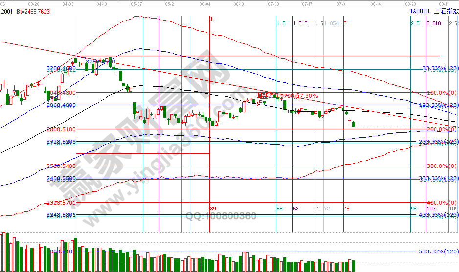 7月30號(hào)波段百分比延伸線零度位2966點(diǎn)受阻,8月1號(hào)時(shí)間窗口跌破極反通道生命線趨勢轉(zhuǎn)弱,重要的這些關(guān)鍵位都是提前給出。下跌已確認(rèn)開始,本輪調(diào)整的目標(biāo)位在7月中旬內(nèi)部VIP學(xué)員培訓(xùn)課上已提出,市場正在按著當(dāng)時(shí)所講的路徑運(yùn)行,穩(wěn)健投資者需要耐心等待月線級(jí)別信號(hào),激進(jìn)者可以參考周線生命線信號(hào),5號(hào)下午在學(xué)員區(qū)從實(shí)戰(zhàn)角度再次給學(xué)員講解極反通道周期共振信號(hào),這是調(diào)整期開倉交易信號(hào)之一,同時(shí)主回調(diào)期板塊都在不斷進(jìn)行解讀。預(yù)期7號(hào)確認(rèn)此信號(hào),8號(hào)是24節(jié)氣立秋,空間上波段百分比延伸線120度2791、江恩價(jià)格四方形2800為支撐,綜合結(jié)論是7號(hào)確認(rèn)周期共振信號(hào)(學(xué)員區(qū)盤中會(huì)通知),激進(jìn)者可以開倉短線博弈。最后講一點(diǎn),3季度市場會(huì)給出一個(gè)極重要底,關(guān)于時(shí)間與位置學(xué)員關(guān)注學(xué)員區(qū)。8月6號(hào)盤中壓力是315度2844點(diǎn),盤中支撐是180度2800點(diǎn)、135度2786點(diǎn),8月時(shí)間窗口9號(hào)、16號(hào)、24號(hào)。操作策略,指數(shù)極反通道生命線進(jìn)入弱勢通道,按失守一線看低一線規(guī)則藍(lán)色下軌線是目標(biāo)位,短線跟蹤好15、30周期共振信號(hào),激進(jìn)者控制在3成以內(nèi)交易。