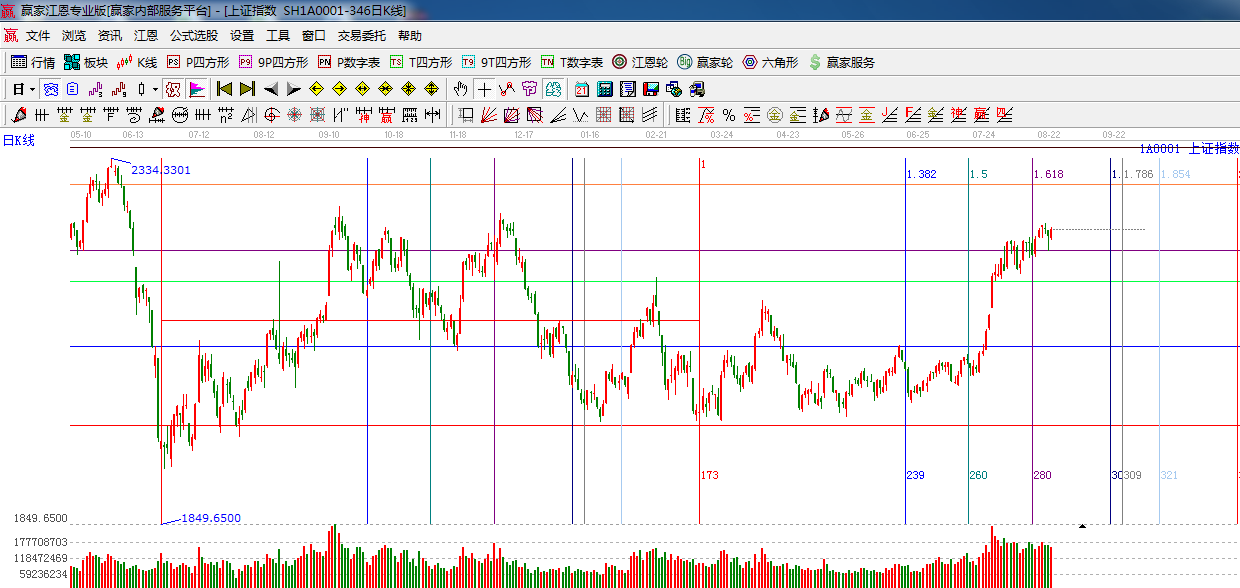 ★依據(jù)贏家江恩系統(tǒng)波段百分比提示:江恩120度位置,震蕩回升, 120度支撐是2204點,六角形90度角度線支撐2210一線,此位置不破,震蕩整理為主。