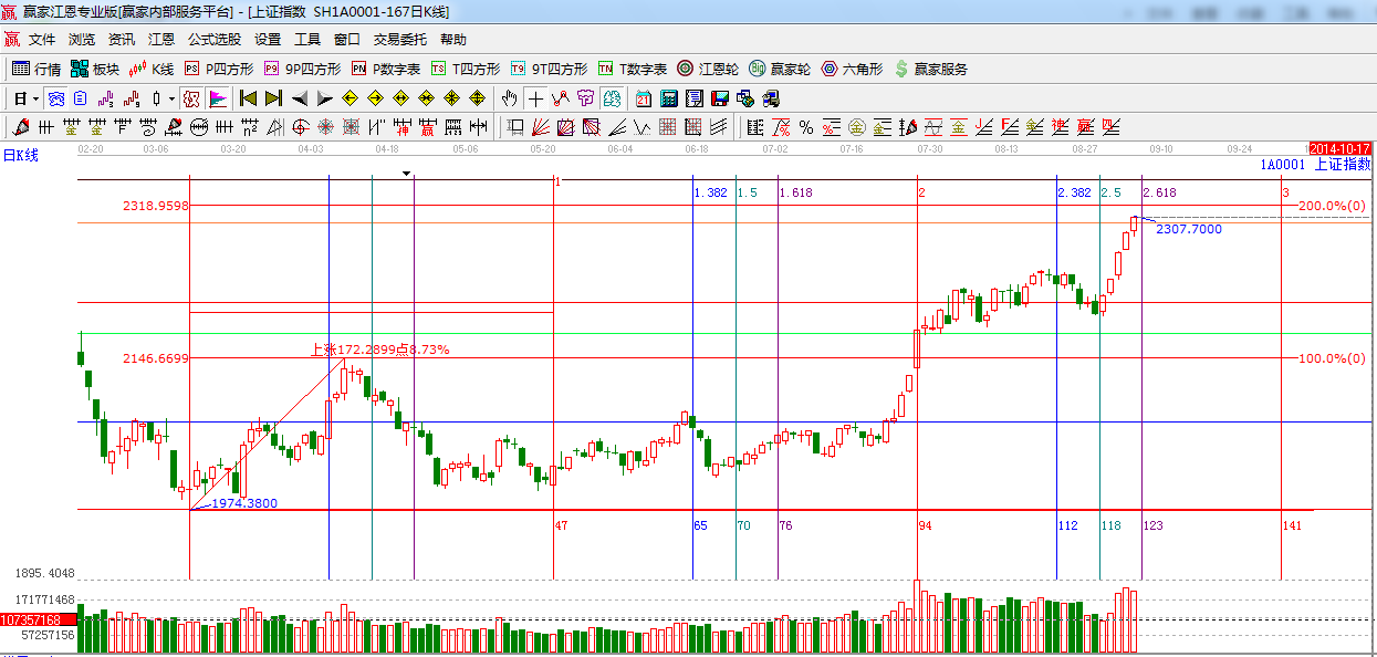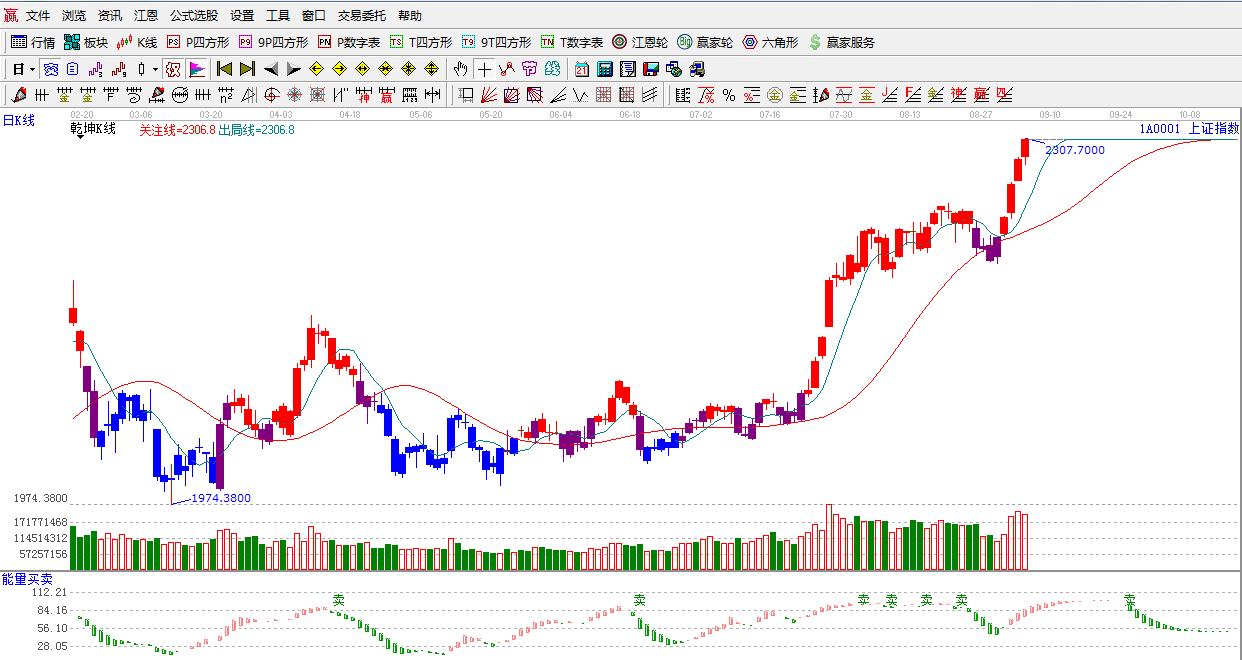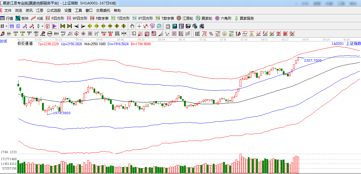 江恩看盤綜述:依據(jù)贏家江恩技術工具分析得出:兩市再創(chuàng)新高,一舉突破2300點關口,成交量繼續(xù)放大,由于上方接近極反通道外軌線,預計短期震蕩上行更可能成為后市主基調。阻力區(qū)間2300-2318附近,今日是9.5日時間之窗。