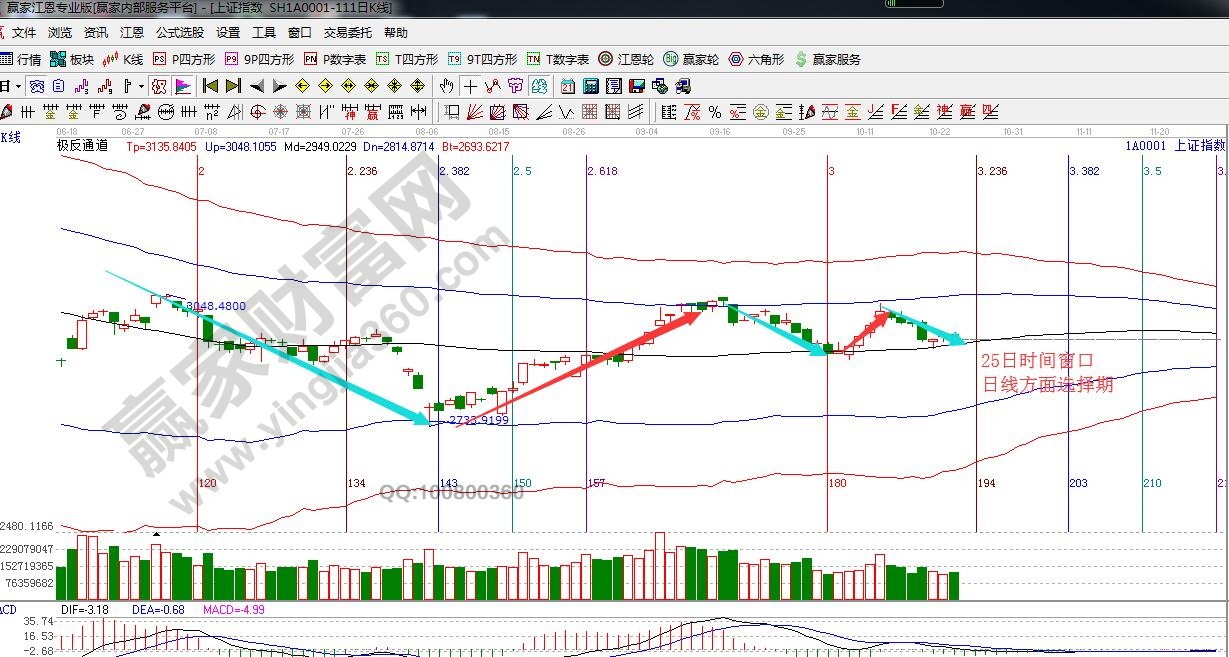 ★依據(jù)贏家江恩理論系統(tǒng)極反通道提示:指數(shù)日K線在黑色生命線2930點上運行,按規(guī)則生命線上看多做多。