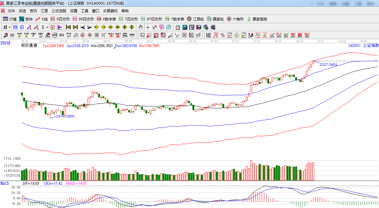 上周,滬深兩市在資金推動下,呈單邊上漲走勢,連續(xù)突破2250點以及2300點兩大阻力位,刷新年內新高,板塊方面出現普漲,其中航天軍工、港口等板塊更是表現突出,截止周五收盤,上證指數已經站上了2326點,上周五又是前期提到的時間之窗,指數又面臨上方極反通道紅色外軌壓力,短期將結束前期伶俐走勢,轉入震蕩,預計本周將沖高回落,操作上,謹慎為主。