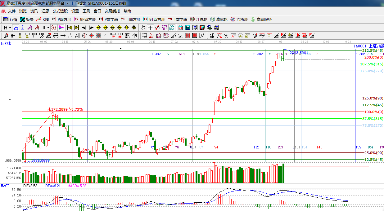 江恩看盤綜述:依據(jù)贏家江恩技術(shù)工具分析得出:周四指數(shù)再次觸摸外軌線,隨后出現(xiàn)跳水,終盤以長上影線的放量十字星報(bào)收,預(yù)示短期將展開震蕩修復(fù)走勢,操作上,可考慮逐步撤離本輪反彈漲幅過大的個(gè)股。