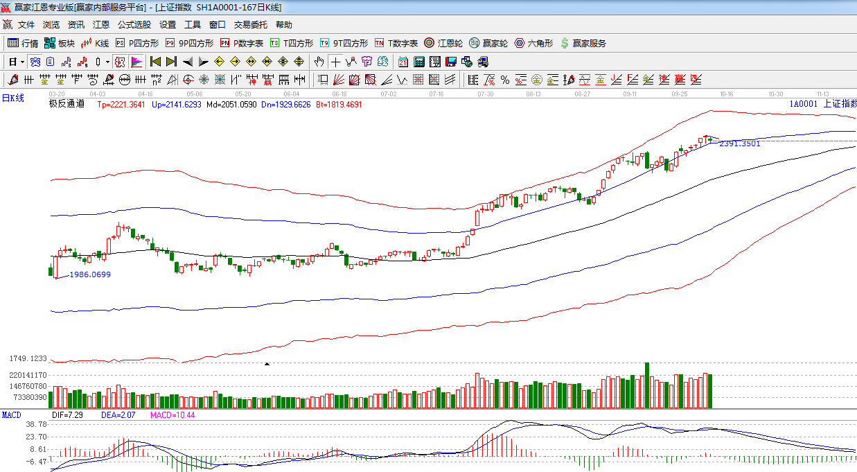 江恩看盤綜述:依據(jù)贏家江恩技術(shù)工具分析得出:今日指數(shù)圍繞外軌線震蕩,終盤以陰十字星報(bào)收,近期指數(shù)高位滯漲以及盤中震蕩加劇,而且macd有高位背離的走勢,,下周重點(diǎn)關(guān)注日線藍(lán)色外軌線的得失,此位置如破位,預(yù)計(jì)市場會出現(xiàn)幾天的日線級別調(diào)整,但以中線而言,短線的調(diào)整并不改變反彈趨勢,目前操作策略上做好倉位的調(diào)整保持3-5成左右。
