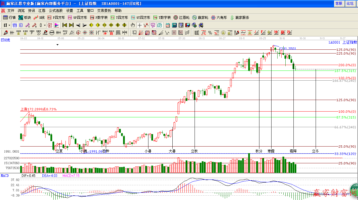★依據(jù)贏家江恩系統(tǒng)波段百分比提示:指數(shù)繼續(xù)低開低走,下方支撐315度2290附近,另外頸線位是2270點(diǎn)。