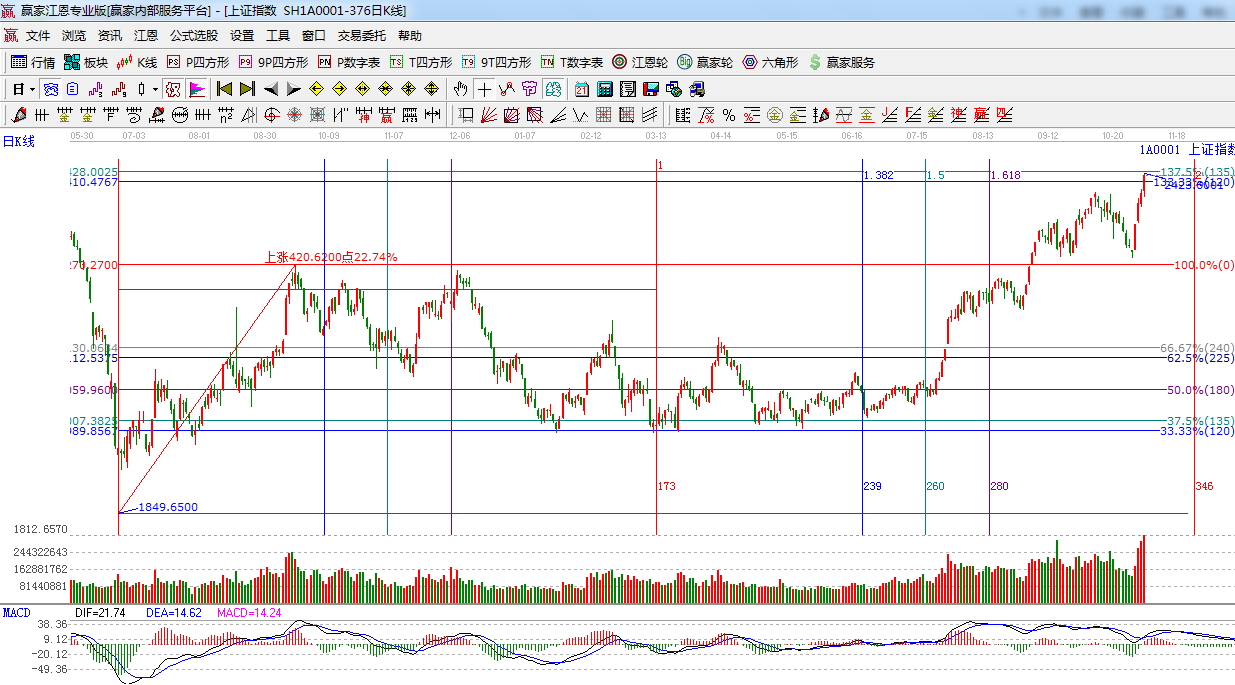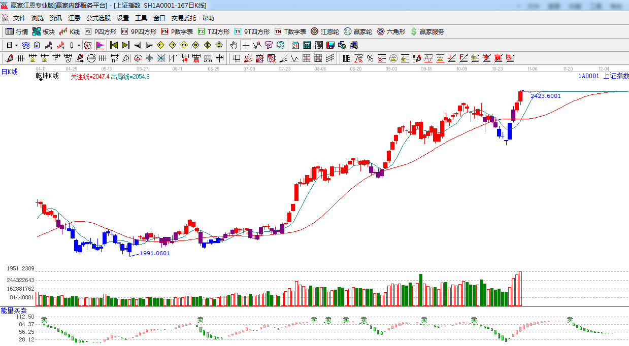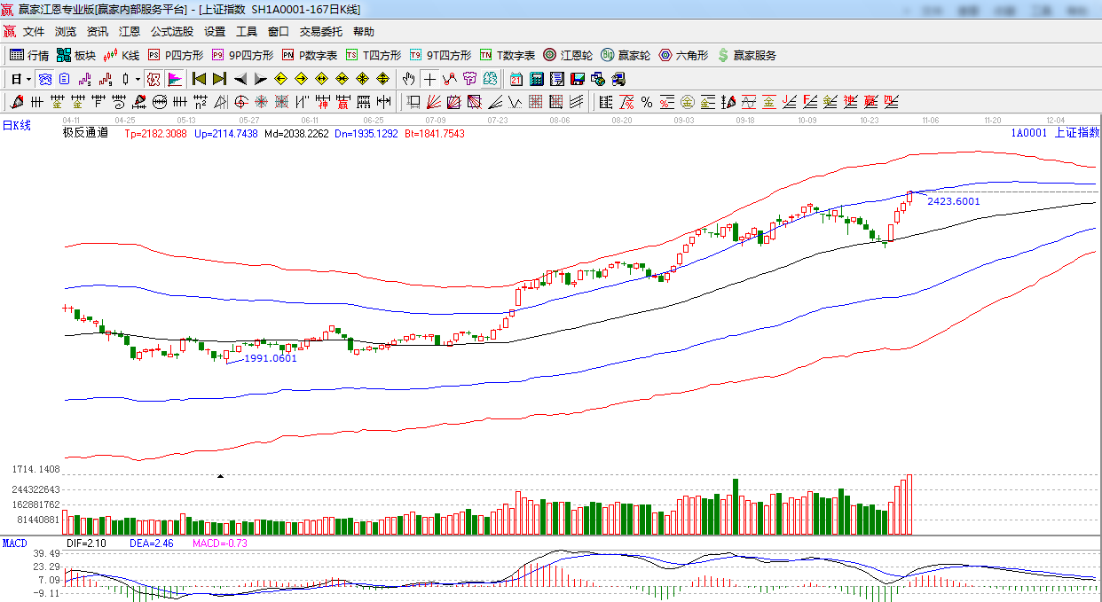 ★依據(jù)贏家江恩系統(tǒng)極反通道提示:指數(shù)繼續(xù)放量上行,突破藍(lán)色外軌2410點(diǎn),留意后期量能,如不能支持,此位置將仍有反復(fù)。