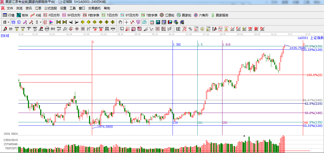 ★依據(jù)贏家江恩系統(tǒng)極反通道提示:藍(lán)色外軌線支撐是2410點(diǎn)附近,留意后期量能,如不能支持,此位置將仍有反復(fù)。