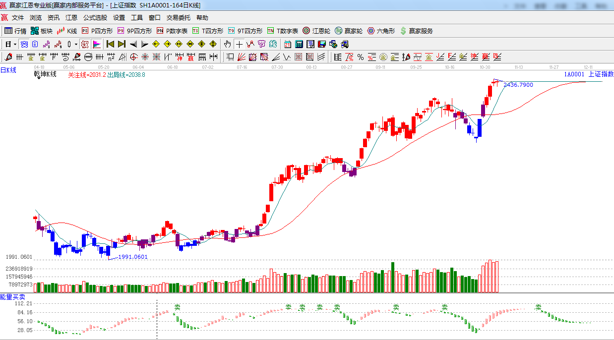 ★依據(jù)贏家江恩系統(tǒng)能量買賣提示:紅色看多能量柱增長(zhǎng),看多。