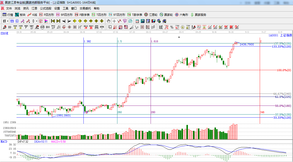 ☆依據(jù)贏家江恩系統(tǒng)波段百分比提示:指數(shù)圍繞135度2428點(diǎn)反復(fù)整理,下方支撐是120度2410點(diǎn),上方阻力180度是2480點(diǎn)。