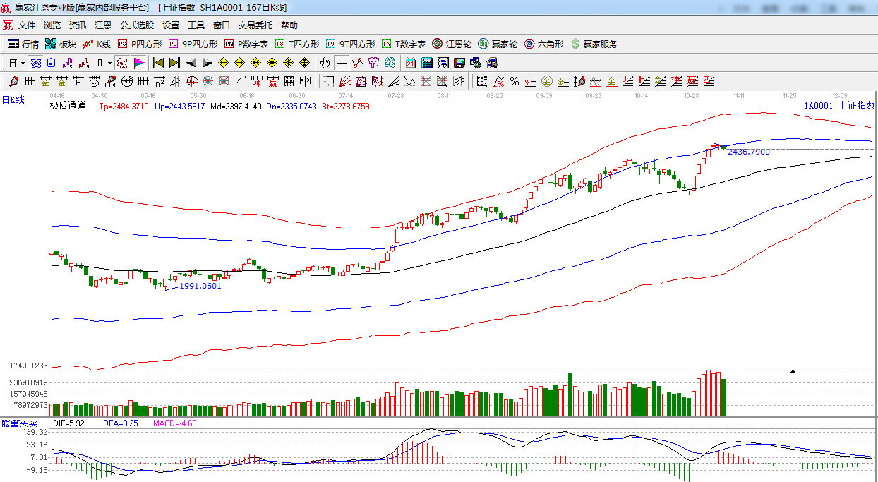 極反通道提示:今日收盤破位藍(lán)色外軌線,短期注意風(fēng)險(xiǎn)。