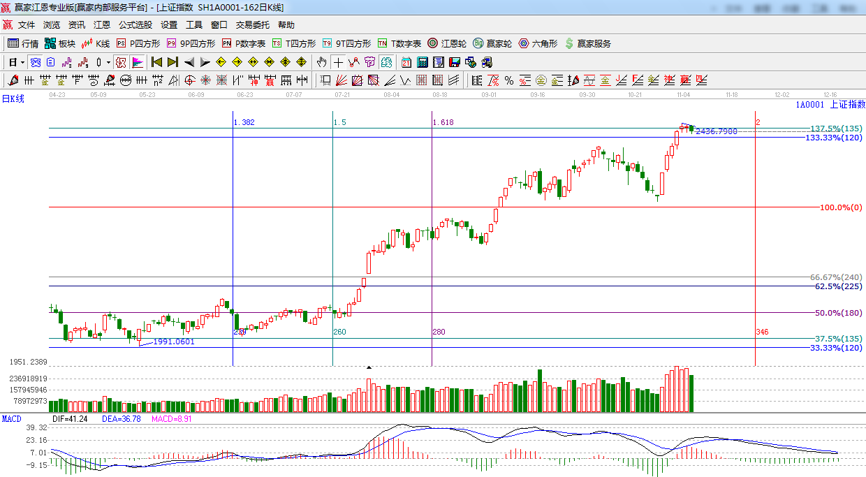 江恩看盤綜述:依據(jù)贏家江恩技術(shù)工具分析得出:上證指數(shù)依舊呈現(xiàn)窄幅震蕩走勢,以小陰線報(bào)收,市場顯然存在調(diào)整需求,下方量能依然保持強(qiáng)勢,短線回踩下方支撐120度2410點(diǎn),前高2391點(diǎn),空間并不大,所以市場可能采取以時(shí)間換空間的方式來消化短線獲利盤以及對指標(biāo)的修復(fù)是大概率事件。