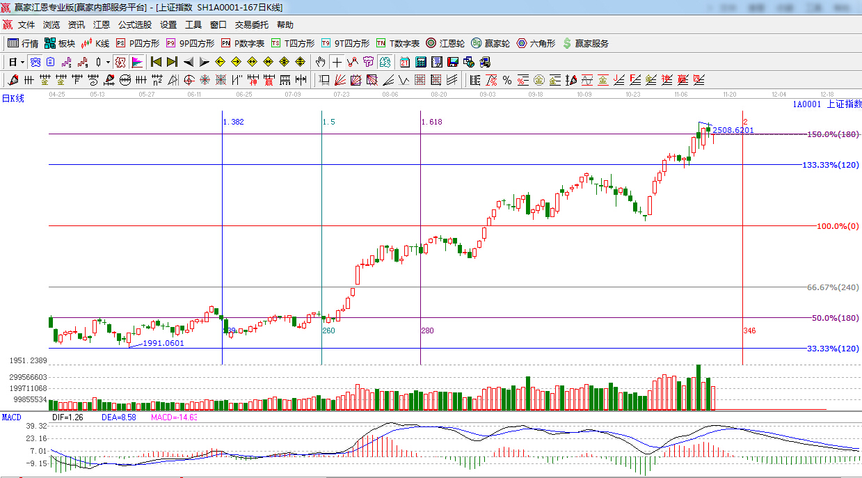 江恩看盤綜述:依據(jù)贏家江恩技術(shù)工具分析得出:周五指數(shù)跳空下探,尾盤小幅回升,以T字線報收,缺口未能完全回補,短線弱勢,今日是滬港通開通之日,留意量能變化,關(guān)注缺口阻力,預(yù)計短期高位震蕩為主。本月重要時間窗11月24日,操作上,適當(dāng)控制倉位,盈利個股提高止損位保護。