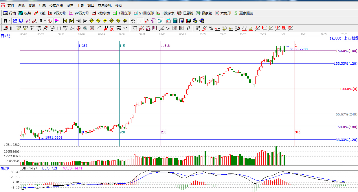 ☆依據(jù)贏家江恩系統(tǒng)黃金時(shí)間周期線提示:重點(diǎn)關(guān)注時(shí)間窗口是11月24日。