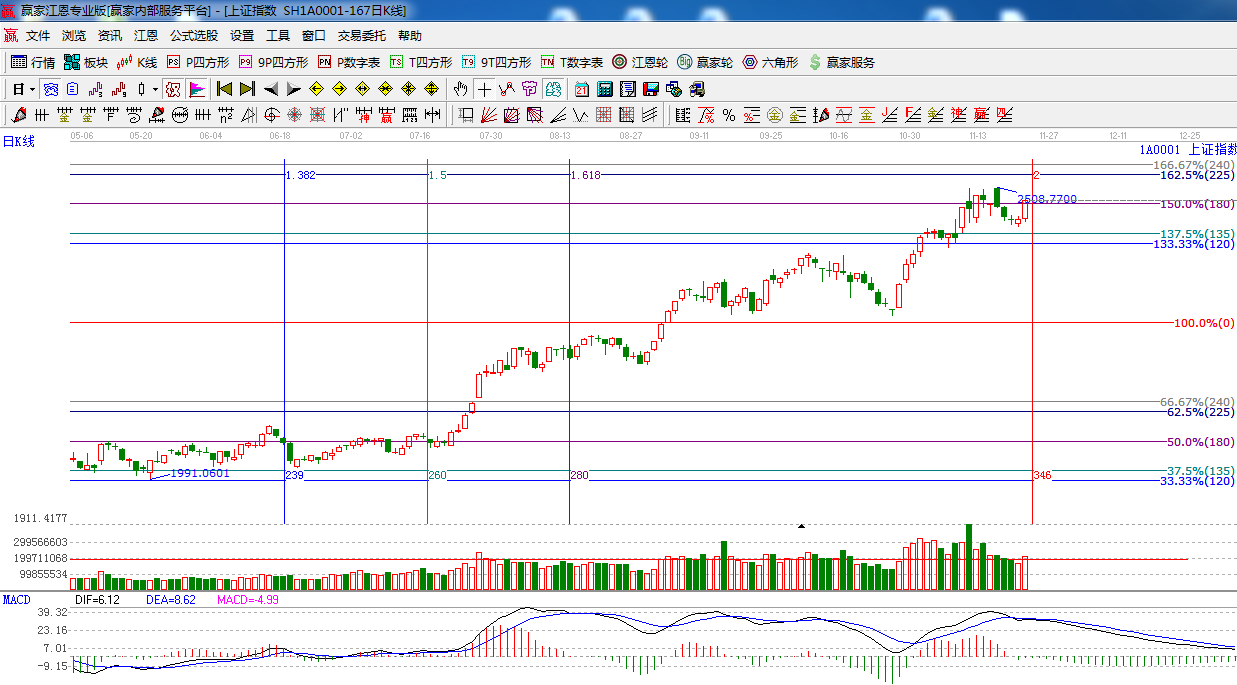江恩看盤綜述:依據(jù)贏家江恩技術(shù)工具分析得出:周五上證指數(shù)在券商為代表的權(quán)重板塊帶動下,強(qiáng)勢反彈,突破180度2480點,180度轉(zhuǎn)換為支撐,今日此位置回踩不破將攻擊前高,前期提到的時間之窗到來,留意近期量能變化,操作上,適當(dāng)控制倉位為主,高拋低吸為主?!?br />