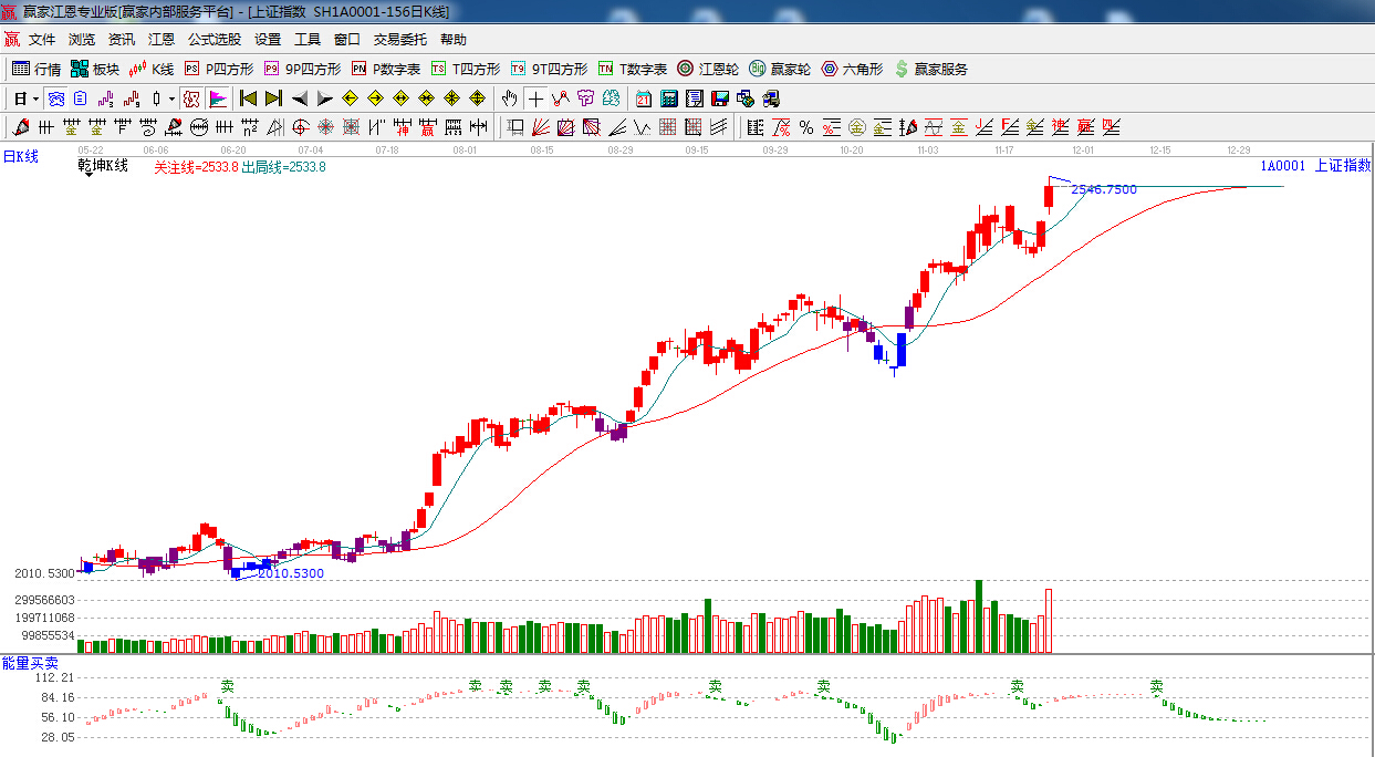 ★依據(jù)贏家江恩系統(tǒng)乾坤K線提示:紅色區(qū)域,短線出局線之上,看多。