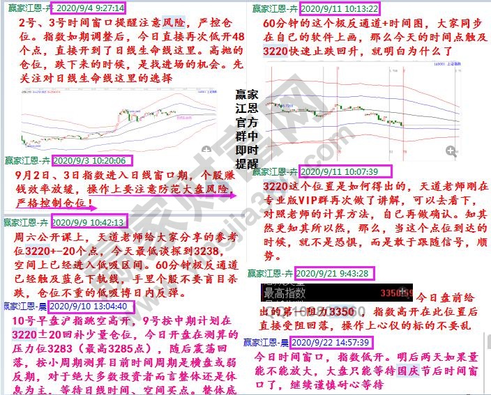 2020年一季度大盤反復摔打創(chuàng)年內低點2646點、二季度小碎步攀升、三季度強勢上攻隨后轉入修整,四季度行情拉開序幕、蓄勢待發(fā)。8、9月份市場在箱體區(qū)間內運行,贏家江恩團隊在正式學員群提前給出箱體策略,原話如下“在一個箱體區(qū)間里做滾動交易--底倉+活動倉,不會輕易的去追漲,而是對持續(xù)跟蹤的標的(日或周強勢區(qū)域)調整幾天后用活動倉參于,上漲到別人想追時賣出?!?/span>學員可在群中搜索“箱體”回顧提出時間進行思考,為何能提前于市場走勢之前就提出相應的策略?當你你又是如何打算的呢?后知后覺者永遠是賣單者,大家看看自己的賬戶,是不是9月份把今年賺的都還給市場了,其中應該不少人8月份就還了利潤,9月份還虧了本金。如這樣都不能讓你明白,擁有一套“投資體系”的重要性,那再來一波牛市,賺的錢最終也不是你的。如果你跟隨專業(yè)的團隊進行學習,在9月初2號、3號時間窗口,提醒降低倉位時控制倉位,不僅保住了利潤還可以根據工具信號在9月11日3220時價點做一個反彈,同樣贏家江恩團隊提前測算出3350壓力,9月底指數再探3200附近,分鐘圖再現時價四方信號。